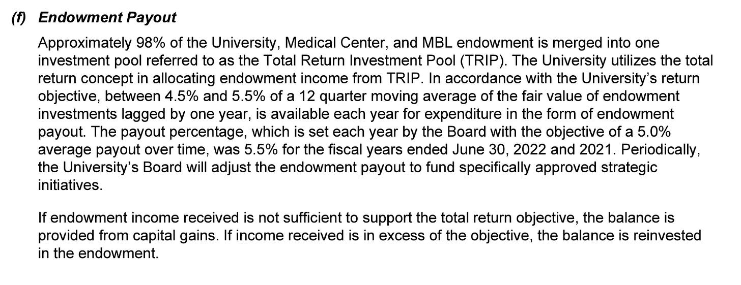 The endowment is also split up into three different endowments: university, medical center, and marine biology laboratory (MBL). Yet these endowments are mixed together, which is called the Total Return Investment Pool (TRIP). Aside from the restrictions placed on what the money can be used for, the next most important policy is how payouts from the endowment get calculated.