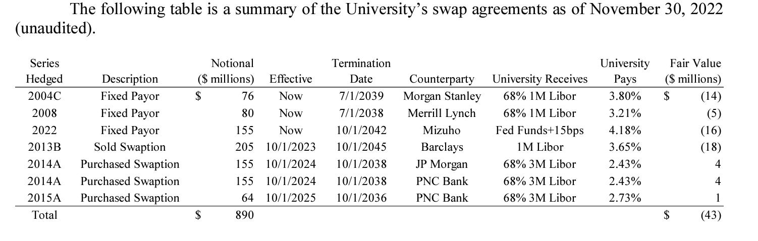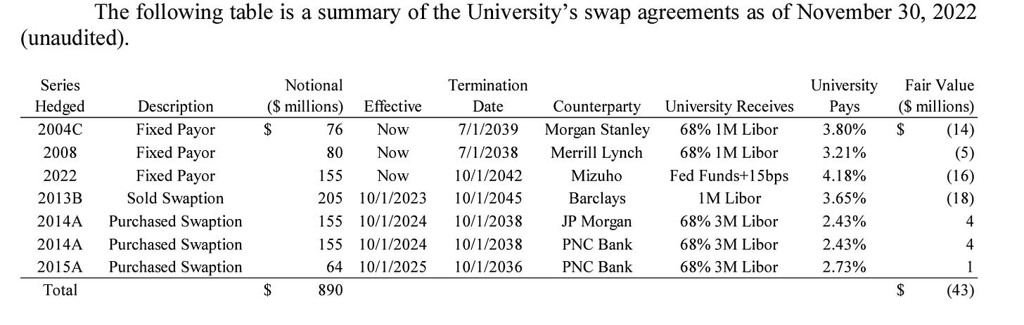 For instance, I found some information about the swap agreements (variable rate deals) the university has done. I don’t have the chops to examine these for funny business—all swaps are sort of funny business, but they’re not necessarily illegal or technically bad by themselves, I guess?—but I put them here for others’ perusal. I guess I’d ask about the relatively high percentage of university payment to Mizuho (4.18%) on Fed funds+15bps on a fair value of -$16 million in 2022. Ando doesn’t get into this stuff. How was that deal negotiated?